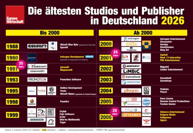 Deck 13, CipSoft, Aerosoft und Kalypso Media zählen zu den Jubilaren unter den ältesten Games-Unternehmen in Deutschland 2026.